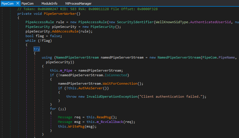 First of all, let's look how the Named Pipe is created and used. When TinyWall starts, a PipeServerWorker method takes care of a proper Named Pipe setup. For this the Windows API provides System.IO.Pipes.NamedPipeServerStream with one of it's constructors taking a parameter of System.IO.Pipes.PipeSecurity. This allows for fine-grained access control via System.IO.PipeAccessRule objects using SecurityIdentifiers and alike. Well, as one can observe from the first screenshot above, the only restriction seems to be that the Client process has to be executed in an authenticated user context which doesn't seem to be a hard restriction after all.But as it turned out (again take a look at the screenshot above) an AuthAsServer() method is implemented to do some further checking. What we want is to reach the ReadMsg() call, responsible for deserializing the content from the message received.