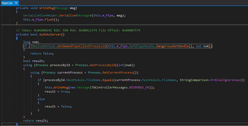 If the check fails, an InvalidOperationException with "Client authentication failed" is thrown. Following the code brought us to a "authentication check" based on Process IDs, namely checking if the MainModule.FileName of the Server and Client process match. The idea behind this implementation seems to be that the same trusted TinyWall binary should be used to send and receive well-defined messages over the Named Pipe.